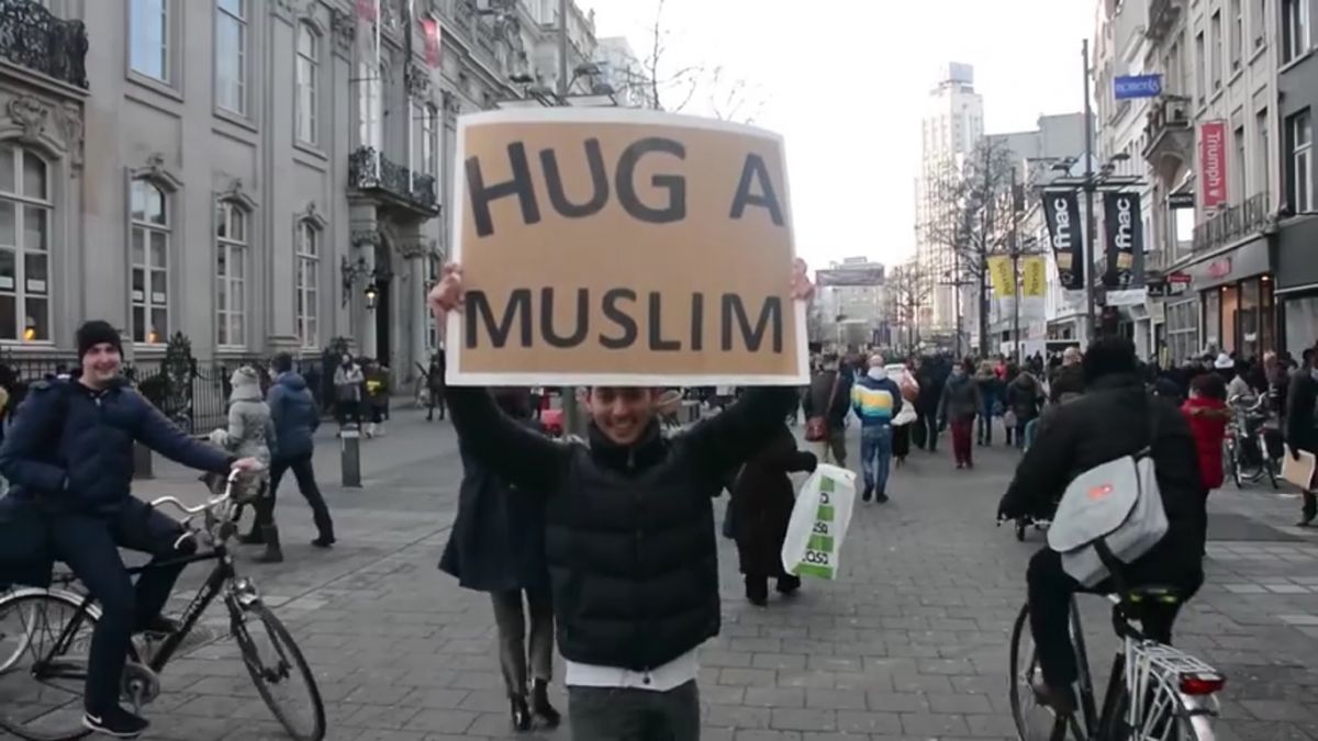 Een moslim, een christen, een jood, een boeddhist en een atheïst: ze staan op straat in Antwerpen met kartonnen borden in hun hand. Op de borden een uitnodiging voor een omhelzing.