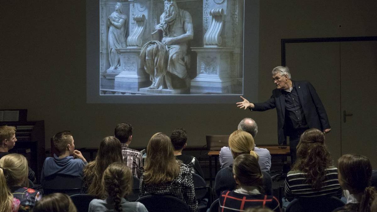 Jan den Ouden, kunstdocent aan het Van Lodenstein College, leidt het onderwerp in. De beamer toont een schilderij van Rembrandt. Twee groepen mensen komen bij Christus. Links staan de farizeeën, zij die Hem niet nodig hebben. Rechts bevinden zich de zieken, de kranken, zij die weten dat ze een dodelijke kwaal omdragen. Zij hebben een Medicijnmeester, een Zaligmaker nodig.