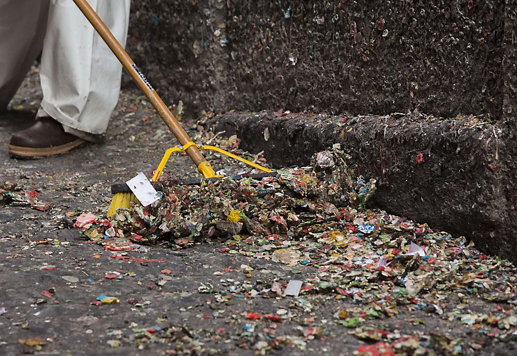 Alle stukjes kauwgom worden van de muur verwijderd met behulp van stomend water, waarna de schoonmakers ze van de grond rapen en weggooien. Vooraf wordt alle kauwgom echter eerst gewogen.
