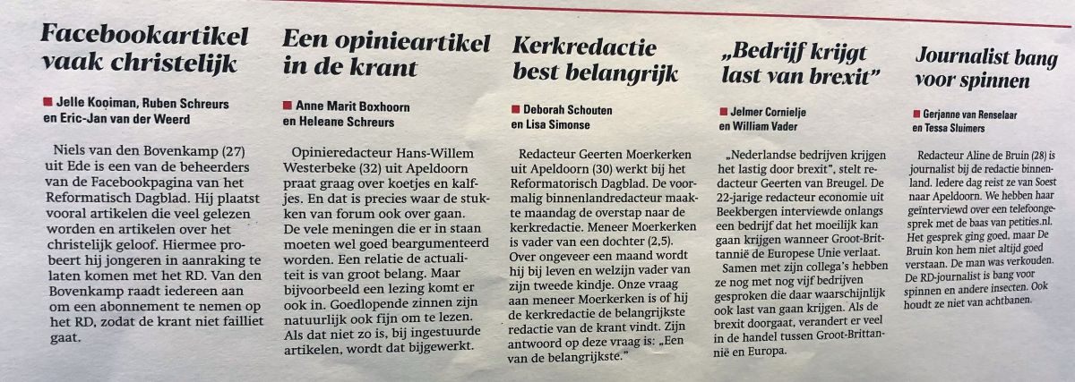 „Nederlandse bedrijven krijgen het lastig door brexit”, stelt redacteur Geerten van Breugel. De 22-jarige redacteur economie uit Beekbergen interviewde onlangs een bedrijf dat het moeilijk kan gaan krijgen wanneer Groot-Brittannië de Europese Unie verlaat. Samen met zijn collega’s hebben ze nog met nog vijf bedrijven gesproken die daar waarschijnlijk ook last van gaan krijgen. Als de brexit doorgaat, verandert er veel in de handel tussen Groot-Brittannië en Europa.