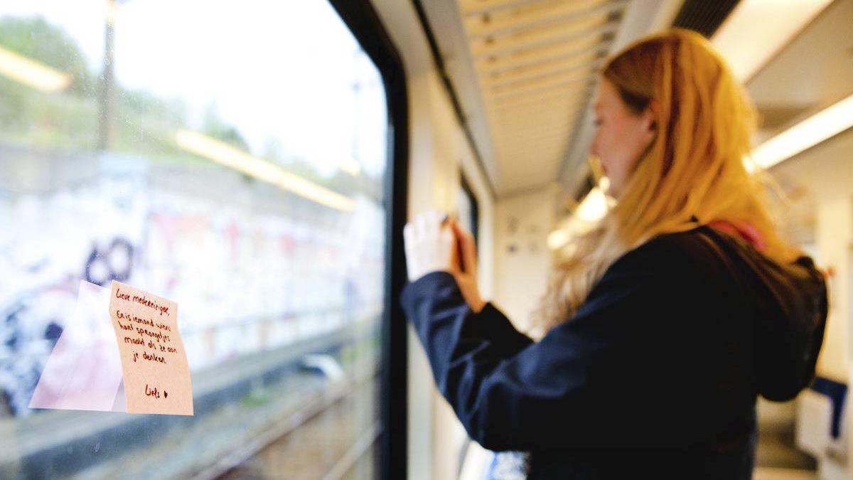 De briefjes die ze achterlaat zijn anoniem. „Ik hang zo’n briefje zo op dat de reiziger het pas ziet als-ie gaat zitten, en ik blijf nooit kijken of iemand mijn post-it vindt."