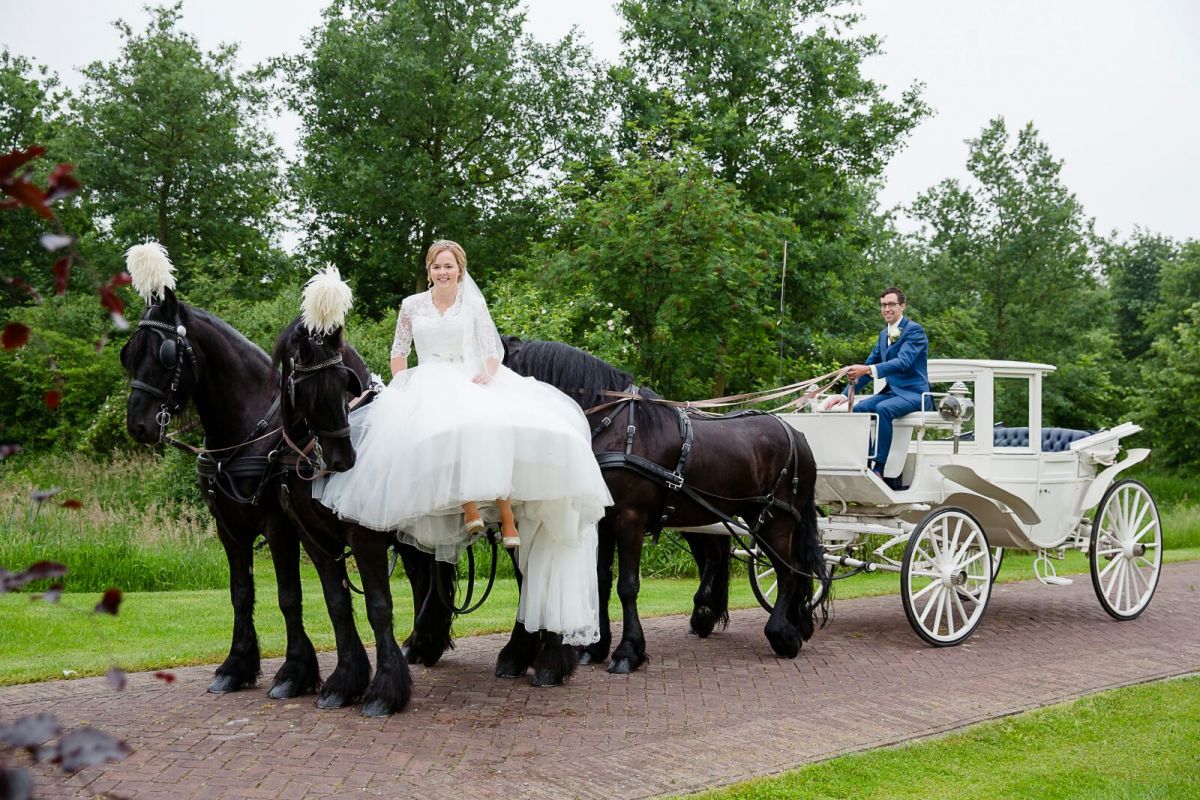 Mariekes vader, die een autobedrijf heeft, had Ruth ’s morgens vroeg al thuis opgehaald in een cabrio. Tot verrassing van de daggasten kwam het bruidspaar na het foto’s maken in een koets terug bij het huis van de familie Barten. „Dat was echt een meisjesdroom van Marieke”, aldus Gerjanne. „Er waren twee paardentrams voor de daggasten. Na de huwelijkssluiting zijn we daarin naar de kerk in Barneveld gereden.”