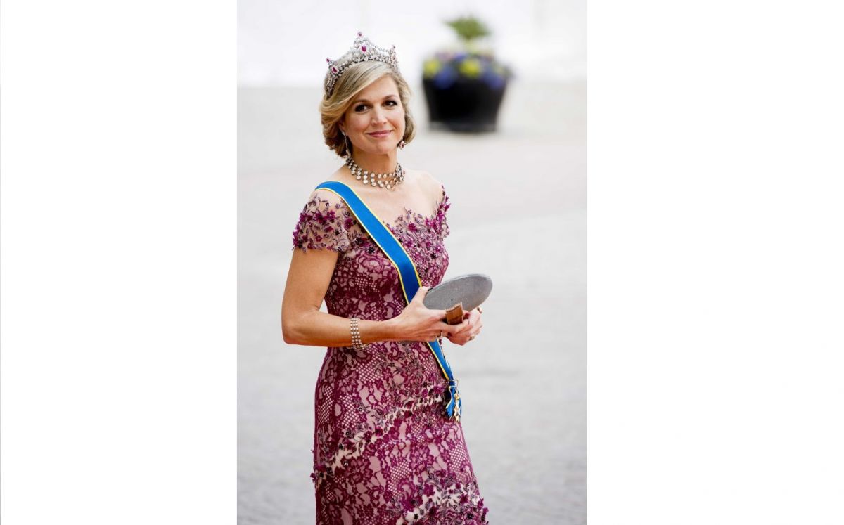 De koningin droeg de jurk die zij ook aanhad op de avond van de inhuldiging van koning Willem-Alexander, op 30 april 2013. Het betreft een robijnrode avondjurk van Jan Taminiau.