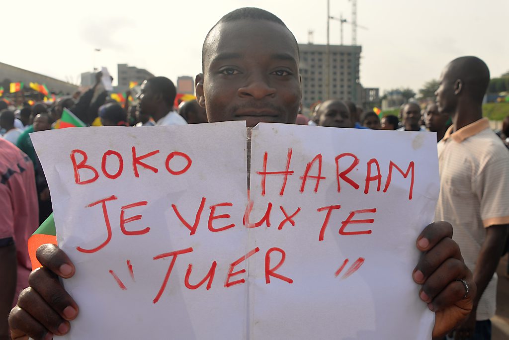 Foto: "Boko Haram, ik wil jou doden", staat er op dit bordje. AFP