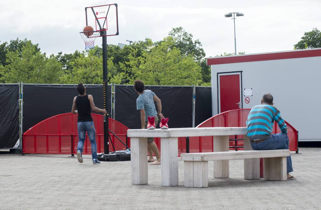 De sfeer in de hal is ontspannen. In de slaapunits liggen her en der mannen op een bed en hangen handdoeken en T-shirts te drogen. Een Syriër –hij loopt op slippers en draagt een kniebroek met de afbeelding van de Friese vlag– tapt koffie bij een automaat. Verderop zit een man sigaretten te draaien; om te roken zal hij naar buiten moeten, waar anderen een potje basketbal spelen.