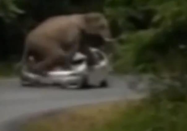 In een van de filmpjes is te zien hoe de olifant zijn lichaam tegen de auto aanschuurt, op de motorkap gaat zitten en er weer afvalt. Een ander filmpje is gemaakt vanuit de auto zelf.