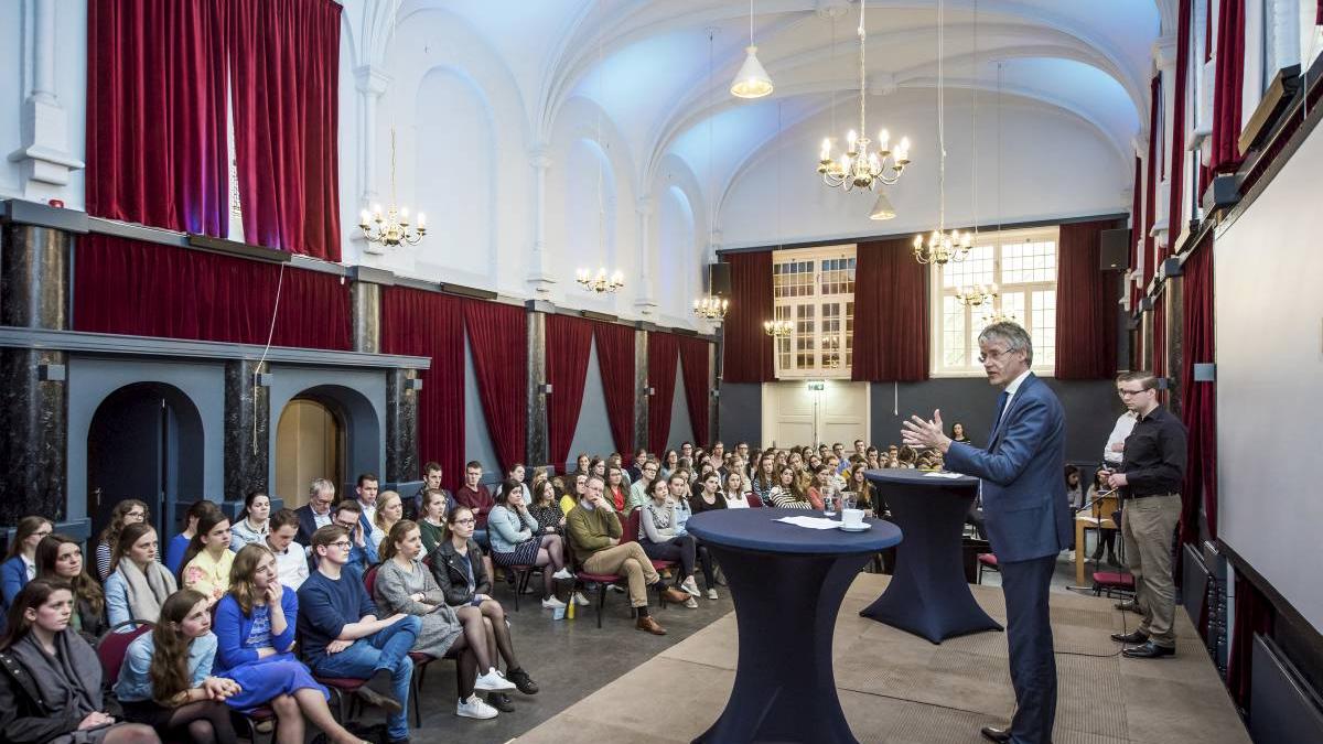 Ook bij oplossingen voor het lerarentekort wijst hij op de verantwoordelijkheid van de studenten. „Het helpt als er veel ambassadeurs voor het onderwijs zijn. Dat kunnen jullie ook met 160 man. Spreek positief over het onderwijs.”