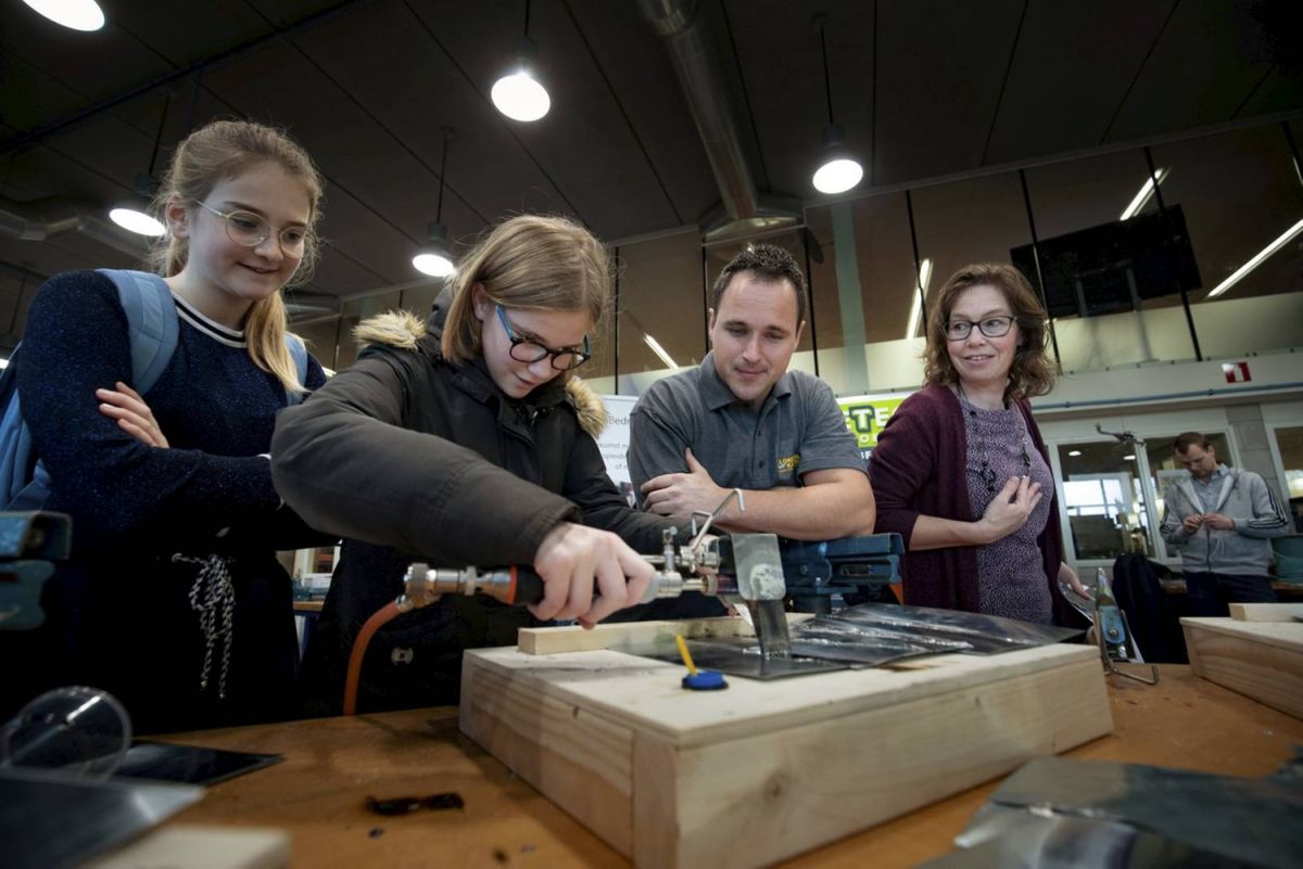 De dertienjarige William Kamp staat bij een stand van Dulasta Metaalbewerking. Hij heeft zojuist een dun metalen plaatje gevouwen tot een kleine vrachtwagencabine. „Dat vond ik het leukste van de dag.” Een paar lokalen verder buigt Maritha Vreeken met een tang vinyldraden om tot de letters van haar naam. „Ik wil een technische opleiding volgen, dus deze dag vind ik heel interessant.” Het is niet voor niets dat het evenement georganiseerd wordt voor leerlingen uit de onderbouw; zij hebben namelijk nog geen richting gekozen. „Vandaag kunnen de scholieren zien dat de technieksector heel gevarieerd is en misschien wel veel breder dan ze altijd dachten”, aldus Trouwborst.