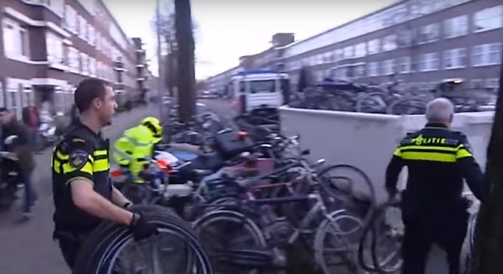 De fietsen zijn maandag door de politie weggehaald, laat een video zien.