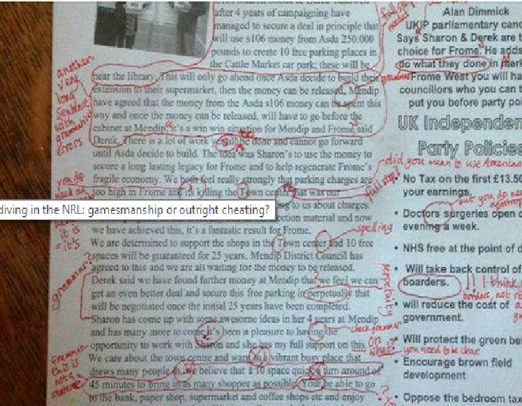De flyer over gratis parkeren werd namens UKIP-raadsleden Sharon Snook en Derek Tanswell verspreid in het Britse stadje in de aanloop naar de verkiezingen in mei. De zoon van de lerares Engels maakte een foto van het verkiezingsmateriaal vol met spel-, stijl- en interpunctiefouten. Die foto werd warm onthaald op het internet.