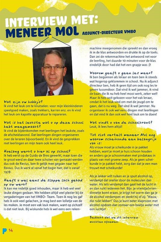 Mol zegt in de schoolkrant op de vraag van leerlingen waarom scheikunde zo belangrijk is: “Als vrouw moet je scheikunde in je vakkenpakket hebben, want je moet je huis schoonhouden en anders ga je schoonmaken met pindakaas in plaats van groene zeep.” Vrouwen die scheikunde niet op het rooster hebben staan, krijgen het advies een man te zoeken die dit vak wél beheerst.