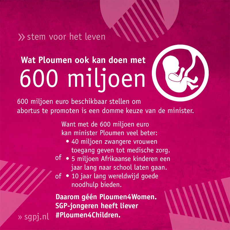 Zaterdag publiceerden de SGPJ een statement op haar website en Twitter, waarin ze wel betere doelen noemen voor de 600 miljoen van Ploumen. "Bijvoorbeeld 40 miljoen zwangere vrouwen toegang geven tot medische zorg, omdat nog veel en veel teveel zwangere vrouwen geen toegang hebben tot pre- en postnatale zorg. Of 5 miljoen Afrikaanse kinderen een jaar lang naar school laten gaan, zodat jonge Afrikaanse levens vol op perspectief hebben. Of 10 jaar lang wereldwijd goede noodhulp bieden."