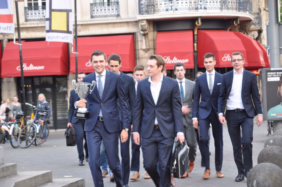 Foto: SGPJ'ers brengen de wisselbeker terug in aanloop naar het debat van 2017. In de hoop dat ze hem 's avonds weer mee naar huis mee mogen nemen.