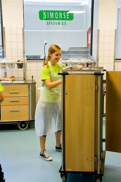 „Eerst heb ik samen met enkele anderen het trappenhuis in het ziekenhuis versierd met crêpepapier. Speciaal voor het personeel. Daarna regelde ik samen met negen anderen de catering. We maakten stokjes met fruit en snoep eraan en prikkertjes met worst, kaas, augurk of ui. Verder bereidden we de broodjes voor de lunch. Na de pauze hebben we nog de borden afgewassen in zo’n grote automatische vaatwasser.”