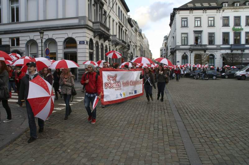 Het Luxemburgplein is het eindpunt van de mars. Even later vormen de jongeren voor het Europees Parlement een Red Ribbon, het internationale symbool voor de strijd tegen aids. Beveiligers kijken wat argwanend. Ze schieten haastig toe als de bal met handtekeningen te dicht bij het Parlementsgebouw komt. Niets aan de hand, legt een van de organisatoren uit.