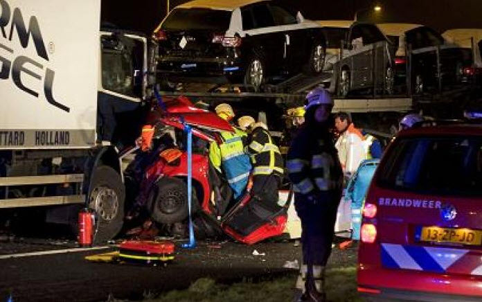 STAPHORST - Bij een kettingbotsing op de A28 bij knooppunt Lankhorst in de richting van Hoogeveen zijn maandagavond twee mensen om het leven gekomen. Acht mensen raakten gewond, van wie drie ernstig. Het ongeval gebeurde door plotseling opkomende mist. - Foto ANP