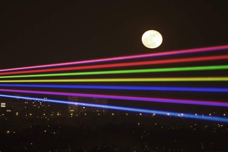 De lasers, in de kleuren van de Universiteit Utrecht zijn de hele week te zien ter viering van het 375-jarig bestaan van de Universiteit Utrecht.
