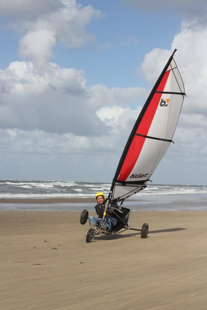 Het hoogtepunt van de dag is echter niet bij de zeehonden te vinden, maar op het strand. Op het zand liggen zeilen, driewielers en helmen. De jongens gaan voor het eerst van hun leven ”blokarten”. Rijden over het strand in een driewieler met daarop een zeil. Instructeur Doeke legt uit: „Zorg ervoor dat je diep onder in de kart gaat zitten. Pak met je ene hand het stuur en met je andere hand dit touw. Je gaat harder door het aan te trekken.”