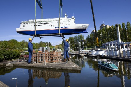 DEN HAAG - Het schip 'Koningin Beatrix' van Stena Line wordt maandag in Madurodam met een 220-tons mobiele telescoopkraan in het water geplaatst naast Hotel New York.