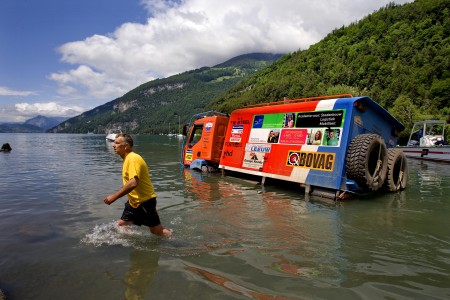 Zijn truck stond na het oprijden van de pont wat scheef en de bestuurder wilde zijn voertuig recht zetten. Daarop kantelde de pont en gleed de vrachtwagen het water in.