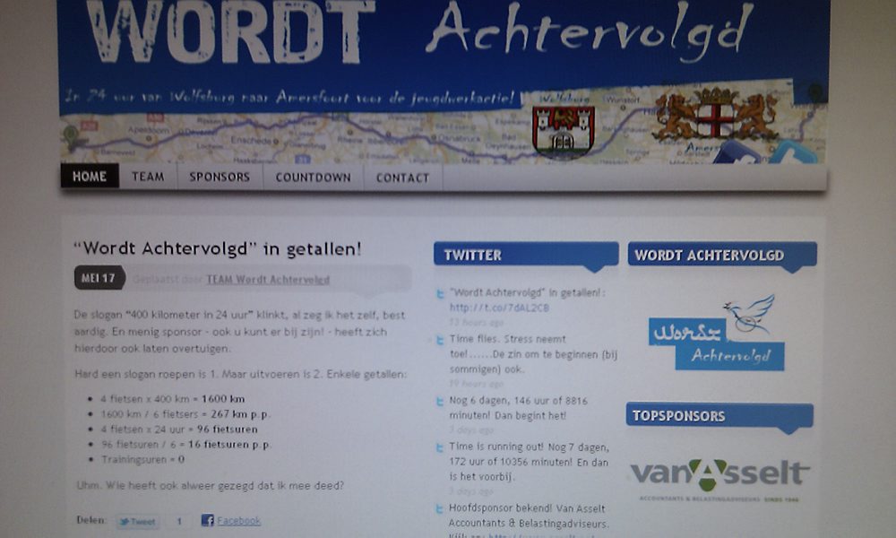 Een scala aan sponsoren maakt deze actie financieel of in natura mogelijk. Zonder {Beek Bikes#http://www.vanbeekfietsen.nl/} geen fietsen en zonder {Wijnands autoservice#http://www.wijnandsautoservice.nl/} geen volgauto. De hoofdsponsor van deze actie is {Van Asselt Accountants & Belastingadviseurs#http://www.asselt.net/}.