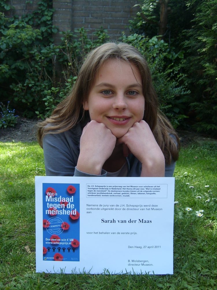 De J. H. Schepsprijs wordt jaarlijks uitgeschreven. Een typische scholierenwedstrijd waarbij leerlingen worden uitgedaagd om een thema uit te beelden. In profielwerkstukken, schilderijen, tekeningen of zoals Sarah deed, in een verhaal. Dit jaar was de opdracht ”Misdaden tegen de menselijkheid”.