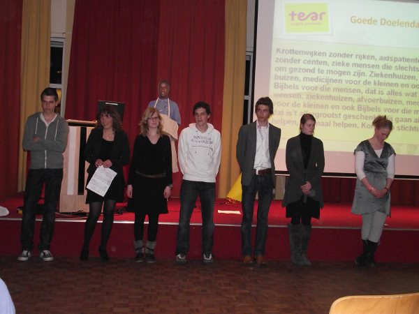 Dhr. Kooijmans krijgt het woord om de commissie te bedanken. Daarna wordt een cheque aan dhr. Trommel overhandigd. Hierop staat het totaalbedrag dat opgehaald is voor Tear. Dhr. Trommel is enorm blij met het bedrag van €9.000, en de leerlingen uit VWO-4 natuurlijk ook.