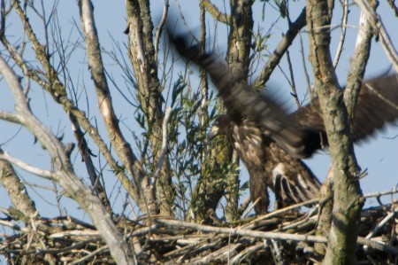 De zeearenden zijn bezig hun nest weer in orde te brengen, want het broedseizoen begint in februari. Tot nu toe hebben zij vijf jongen grootgebracht. Het eerste en tweede jaar broedden ze een ei uit, het derde jaar twee en vorig jaar weer een. Toen lagen er wel twee eieren in het nest, maar er kwam er maar een uit.