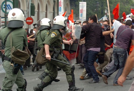Ongeveer 100.000 Grieken protesteerden gisteren in het hele land tegen de voorgenomen bezuinigingsmaatregelen om Griekenland van de financiële ondergang te redden. Het openbare leven in Griekenland lag gisteren stil door een nationale staking. Honderdduizenden ambtenaren legden een dag eerder het werk al neer. Gisteren kwamen het openbaar vervoer, de veerdiensten en het vliegverkeer stil te liggen. Ook onder meer scholen en veel kantoren waren dicht. Het was de derde algemene staking in evenzoveel maanden.