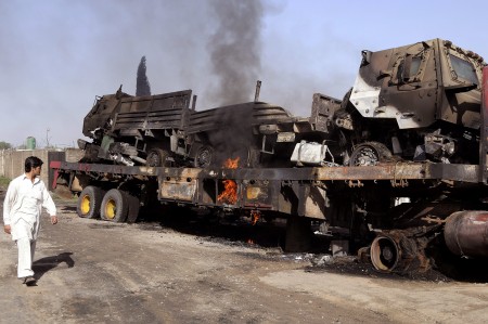Meer dan vijftig vrachtwagens werden bij Tarnol, circa 15 kilometer ten zuidwesten van hoofdstad Islamabad, door gewapende overvallers in brand gestoken.