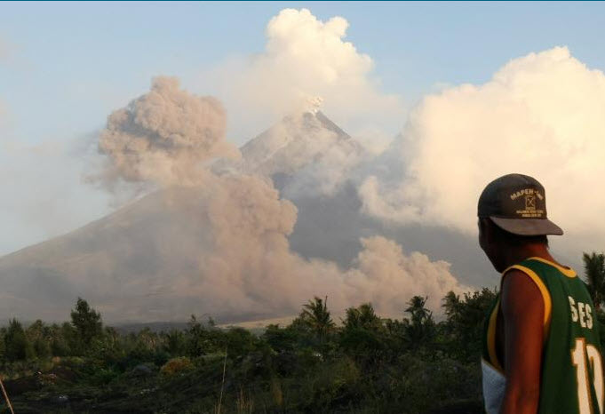 FILIPIJNEN - De vulkaan Mayon op de Filipijnen staat op springen. Grote aswolken hangen dinsdag rond de berg. Vulkanologen verwachten dat de vulkaan binnen enkele dagen zal uitbarsten. Drie dorpen zijn al bedekt met een laag as. Harde explosies zijn te horen. Veel mensen weigeren te evacueren. - Foto EPA