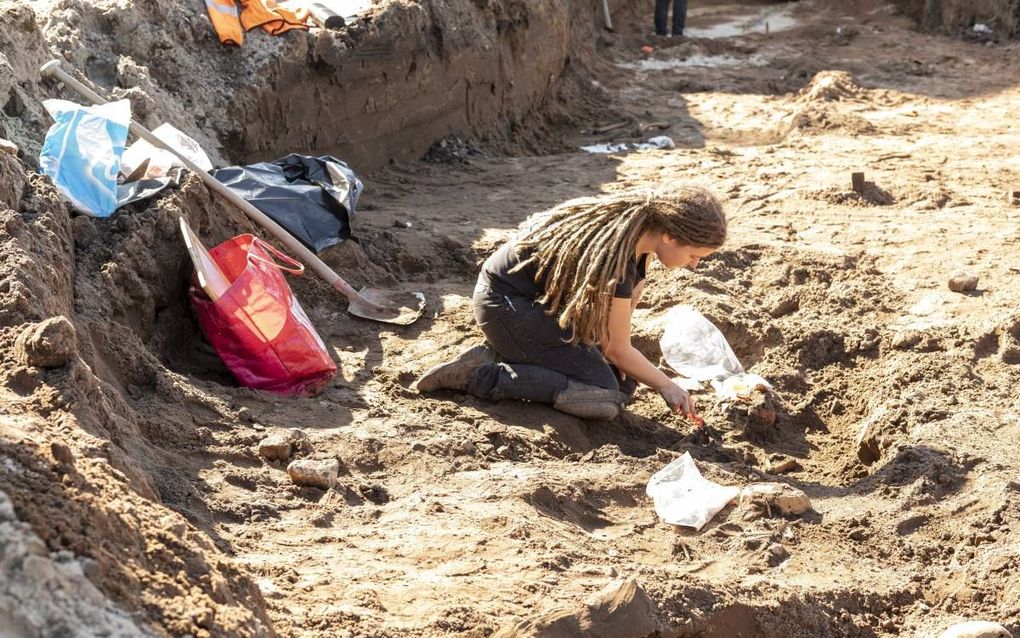 Voorzichtig schraapt de kraanmachinist een laagje aarde weg. Archeoloog Leonie Ouwerkerk maakt een handgebaar naar hem: even wachten. Met haar schop legt ze een stukje bot bloot. Daar wordt heel zorgvuldig met een troffel en een borsteltje omheen gewerkt. Totdat het hele bijbehorende skelet tevoorschijn komt.
