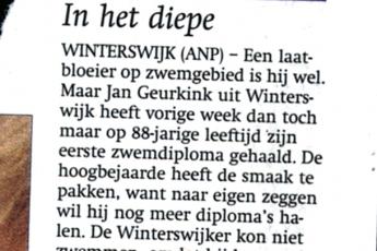 WINTERSWIJK - „Zullen we dit maar als uw laatste interview beschouwen?” De 89-jarige Jan Geurkink uit Winterswijk knikt opgelucht na die vraag van de badmeester. „’t Is leuk om een zwemcertificaat te hebben. Maar is dat nou zo bijzonder?”