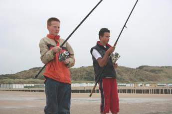 Coen loopt een paar stappen achteruit het strand op. Hij draait aan de molen van de werphengel zodat de lijn strak staat en zet die in een standaard. Daarin staat al de hengel van zijn vriend René den Hollander (14) uit dezelfde plaats.