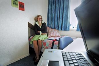 Een bed past er net in. En een klein bureautje. Maar als er vrienden van haar studiekring komen, dan vraagt Alinda Bosman (20) vaak de kamer van haar buurmeisje te leen. Voor een extra stoel is er geen ruimte. En haar kleding? Die ligt in een doos, want een kast is er niet.
