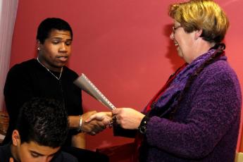 De situatie is maar een oefening. Didier en zeven andere jongens van de Aquariusschool in Almere hebben het al verschillende keren in scène gezet, omdat ze straks echt als beveiliger aan het werk gaan. Vanaf 5 maart rijden ze als steward mee met schoolbussen van en naar het station om vechtpartijen in de bus te voorkomen. De eerste rit start om halfnegen. Om drie uur is de tweede en laatste bustoer. Gisteren kregen de jongens hun stewarddiploma uitgereikt door burgemeester Jorritsma.
