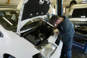 In de werkplaats van autobedrijf Valkenburg in Veenendaal staan zes auto’s. Twee monteurs zijn er aan het werk. Op de brug, iets boven de grond, staat een zwarte Fiat Seicento uit 1997. Bert-Jan Roseboom (15) uit Lunteren vervangt het luchtfilter en controleert het oliepeil. „Iets te weinig olie is niet zo erg. Als er maar niet te veel in zit.”