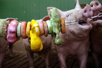Bijtringen voor varkens dus. Maar dan wel een ring met een lekker smaakje. Niet een bijtring met één smaakje, dat is veel te kaal. Het moet een heuse smaaksensatie zijn, zo’n ring. Het varken gaat al bijtend en likkend op ontdekkingstocht. En zo zoekend, ontdekt het beest zichzelf. Wie ben ik? En wat wil ik nu eigenlijk? Een ideaal ontwikkelingstool voor het jonge varken.