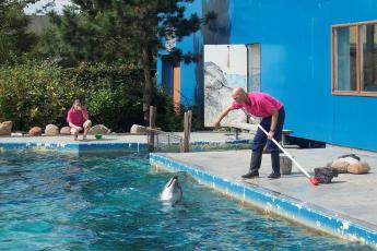 Marieke en Anette mogen na afloop van de training even kennismaken met de dolfijnen. Voordat ze de dieren aanraken, moeten ze hun handen wassen en ringen en armbanden afdoen. Wouterse: „We zijn zuinig op onze dieren en zien niet graag dat ze ziek worden of iets inslikken. Wanneer dat gebeurt, moeten we het eruit halen. Een dolfijn opensnijden kan niet, dus moeten we ’m laten kotsen. En dát is voor niemand leuk. Een andere optie is er niet, anders gaat-ie dood.”