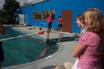 Dolfijn nummer drie mag een salto boven water maken. Als een speer spurt het dier weg, na een handgebaar van een trainster. Halverwege het bassin schiet hij omhoog en maakt een draai door de lucht. Klabats, het water spat hoog op als het dier neerkomt. De twee vriendinnen kijken met een brede glimlach toe.