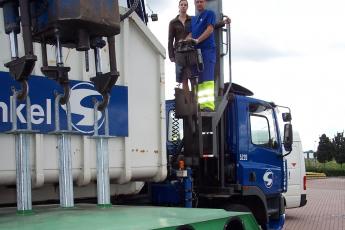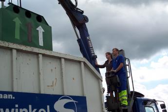 Ruud takelt een glasbak omhoog en laat zijn kraan aan een van de drie hendels trekken die boven op de bak zitten. Onder de glasbak gaat een klep open en het groene glas rolt keurig in het achterste deel van de wagen. Daarna volgen het bruine en het witte glas. Ruud: „Dit gaat zo snel achter elkaar dat mensen denken dat alles bij elkaar komt. Ik kan moeilijk iedereen mee naar boven nemen om te laten zien dat er echt drie compartimenten zijn.”