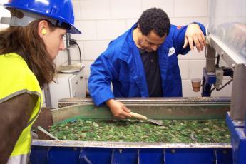 Anita reist het glas achterna en ziet hoe de vrachtwagens van Van Gansewinkel bij het bedrijf aankomen. Zij lossen hun vracht opnieuw in drie delen: netjes kleur bij kleur. Het binnenvaartschip dat aan de kade wordt gelost, heeft glas in allerlei kleuren aan boord. Dit zogenaamde bonte glas is vandaag aan de beurt om te worden verwerkt. Hoofd buitendienst Henk Brouwer wil best een rondleiding geven, „maar dan moeten jullie wel veiligheidskleding aan.” Dat betekent stevige werkschoenen en een hesje aan, een helm en veiligheidsbril op en oordopjes in.