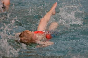 Armen, benen, lang! Armen, benen, lang!” Badmeester Ger Heeringa van Sportinstituut ’t Loo uit Apeldoorn geeft spartelende kinderen aanwijzingen. Ze gaan er zichtbaar beter door bewegen.