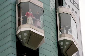 De balkons zijn omzoomd met goudkleurig gebloemd traliewerk. Gratis is deze luxe natuurlijk niet. „Hier slapen vooral zakenmensen die dit kunnen betalen”, zegt receptioniste Constance Blokzijl. „Helemaal bovenin, onder het witte koepeltje, zit onze Top Suite. Het witte koepeltje kan opengeschoven worden, zodat de huurders van de Top Suite op 50 meter hoogte onder de sterrenhemel kunnen slapen.” Kosten? „Door de weeks 450 euro per nacht, in het weekend 575 euro.”
