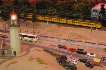 Na 24 minuten dimmen de tl-buizen dimmen, het wordt avond. De lampen op de modelspoorbaan gaan aan: op straat, maar ook in de huizen. Ook het licht van de vuurtoren gaat branden. Alleen de badgasten op het strand blijven ’s nachts liggen. Ach, waarom ook niet: over een paar minuten is het toch weer dag.