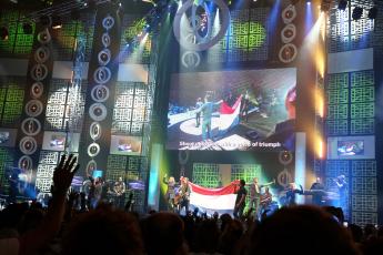 Zaterdagavond, het Gelredome. De groene grasmat, het vaste vloerkleed van profvoetbalclub Vitesse, is naar buiten geschoven. Binnen, op de betonnen vloer, drommen jongeren en ouderen samen. De tribunes links en rechts zitten nagenoeg vol. Ondanks de toegangsprijs van 27,50 euro -„speciale jubileumprijs” omdat de EO, organisator van het concert, veertig jaar bestaat- is de Arnhemse voetbaltempel vanavond met 18.000 bezoekers goed gevuld.