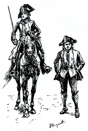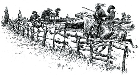 De vrijwillige ruiterij van de Bataafsche republiek had niets geen pleizier. Burger van Putten vooral was danig uit zijn humeur. Hij had een paar snaphanen bespeurd onder het wapentuig van de boeren, en die dingen stonden hem erg tegen. ’De burgemeester heeft goed praten,’ mompelde hij, ’maar hij kent de kracht van de kogels zoo niet als wij militairen.’ Doch wat gebeurt er?
