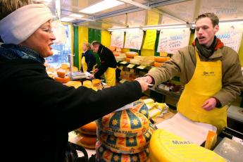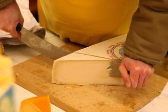 Mmm. Makkie. Even een hele kaas pakken, die eerst doormidden snijden, daarna een mooie punt afsnijden. Maar door de kou valt het snijden van de kaas vies tegen. Met één hand houd ik de kaas rechtop, met de andere sla ik het mes erin. Ik maak mezelf zo lang mogelijk, zodat ik met gestrekte armen, puur door mijn gewicht, het mes door de kaas kan duwen. De dame lacht: „Je hebt mooi de tijd. Het is nog rustig.” Dat klopt, maar niet lang meer.