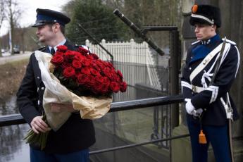 DEN HAAG - De werkdag van de marechaussees bij het hek van Paleis Huis ten Bosch in Den Haag ziet er deze donderdag anders uit dan anders. Met enige regelmaat komen mensen boeketten en kaarten afgegeven ter gelegenheid van de 70e verjaardag van de koningin.