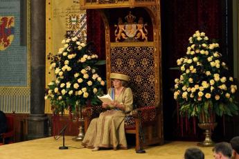 LEIDEN (ANP) – Koningin Beatrix gaat met haar tijd mee wat betreft uitspraakverandering. Het blijkt namelijk dat ze de letter R niet uitspreekt aan het eind van woorden als ’weer’ en ’maar’.